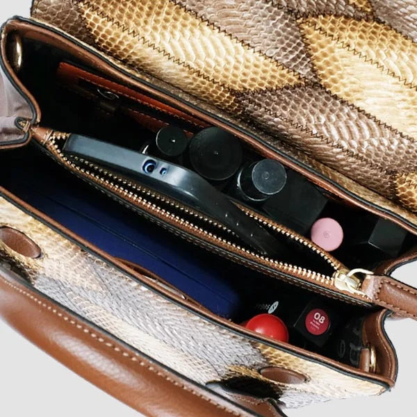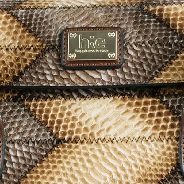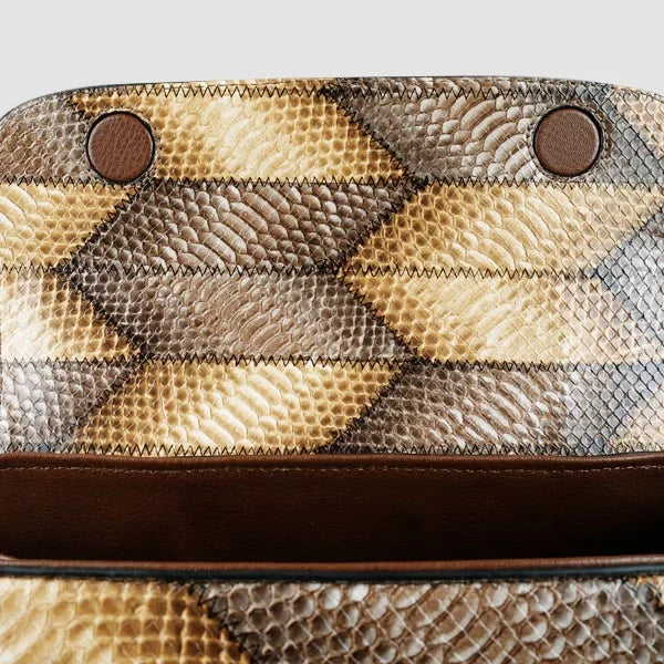 Susan's luxurious snakeskin with brown vegan leather accents exudes elegance, blending luxury with ethics.