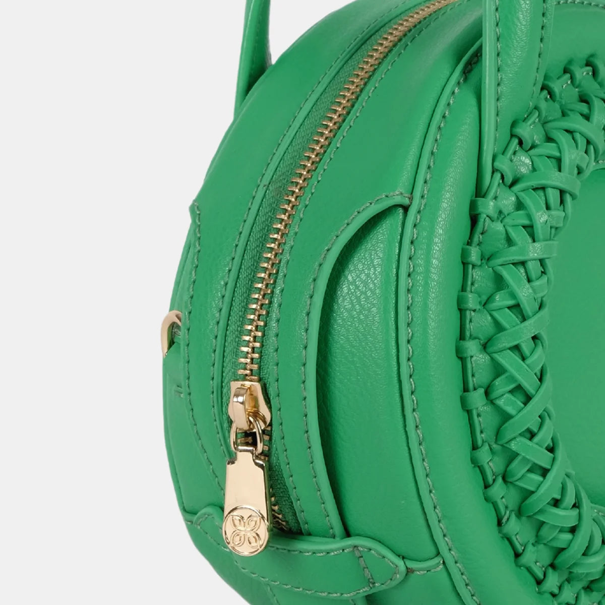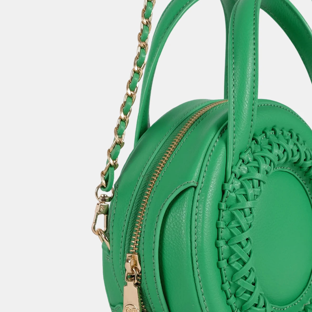 FEATURES- Chic round crossbody bag with handwoven details