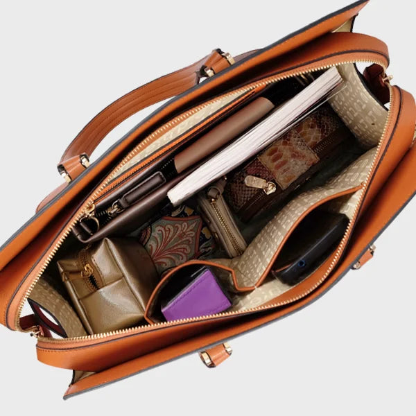 Explore the spacious interior of the Judith Tote, designed to easily accommodate a laptop and all your daily necessities.