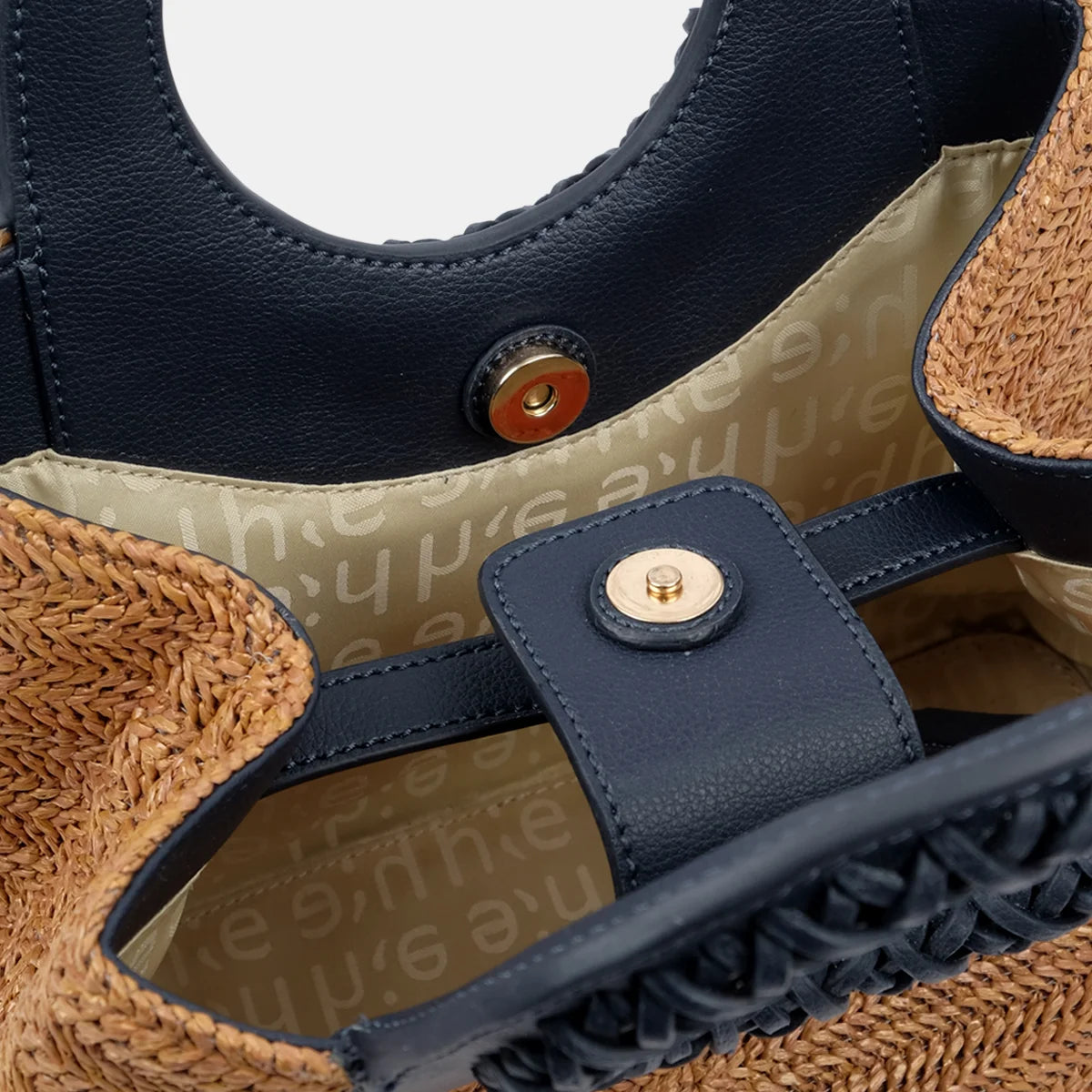 - Crafted from woven raffia with vegan leather trims