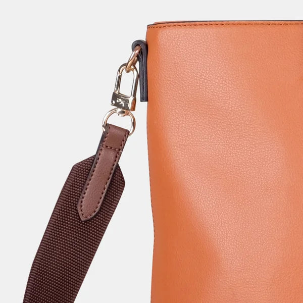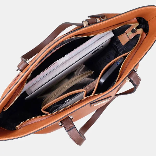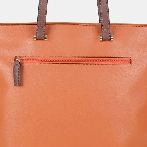 The Leena Tote is your go-to daily wear bag, designed with both style and functionality in mind. Featuring a contrasting handle, this tote adds a touch of sophistication to your everyday look. Its spacious interior easily fits a laptop and other essentials, making it perfect for work or daily errands. The back zip pocket provides secure storage for small items, while the detachable webbing crossbody handle offers versatility and convenience. Whether you carry it by the hand or wear it across the body, the Leena Tote seamlessly adapts to your needs, blending practicality with effortless style.