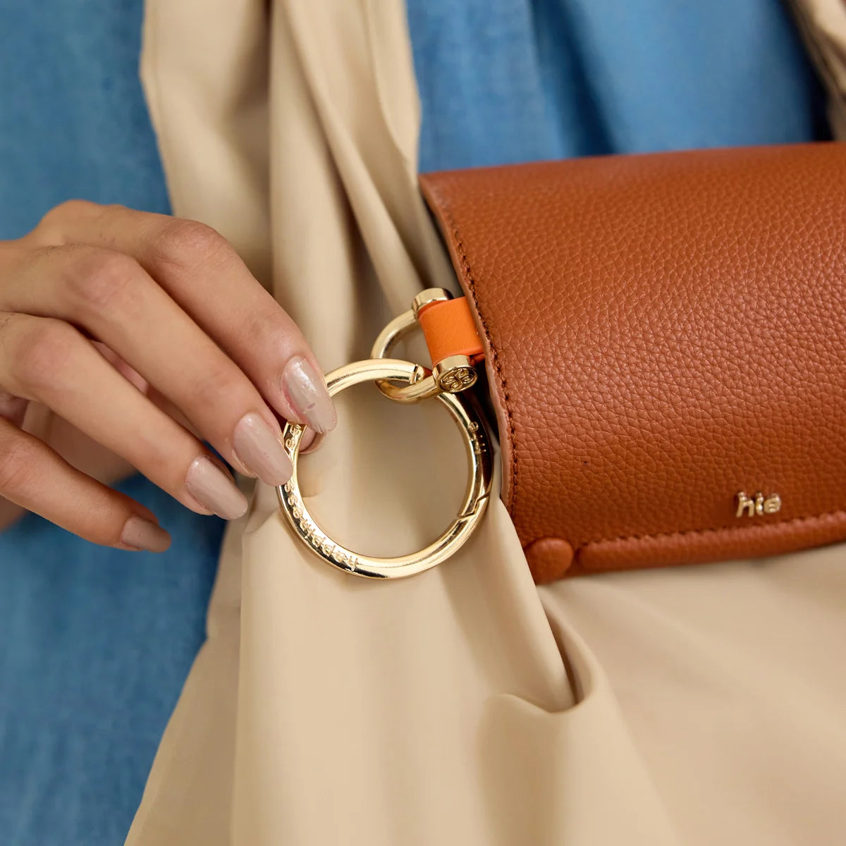 •Includes a detachable golden metal keychain loop with vegan leather cover