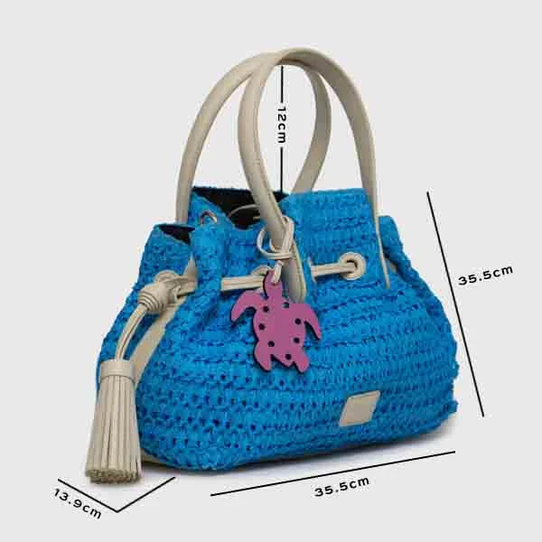 Sophisticated Security: Maria's drawstring closure and hanging tassels offer both style and secure elegance.