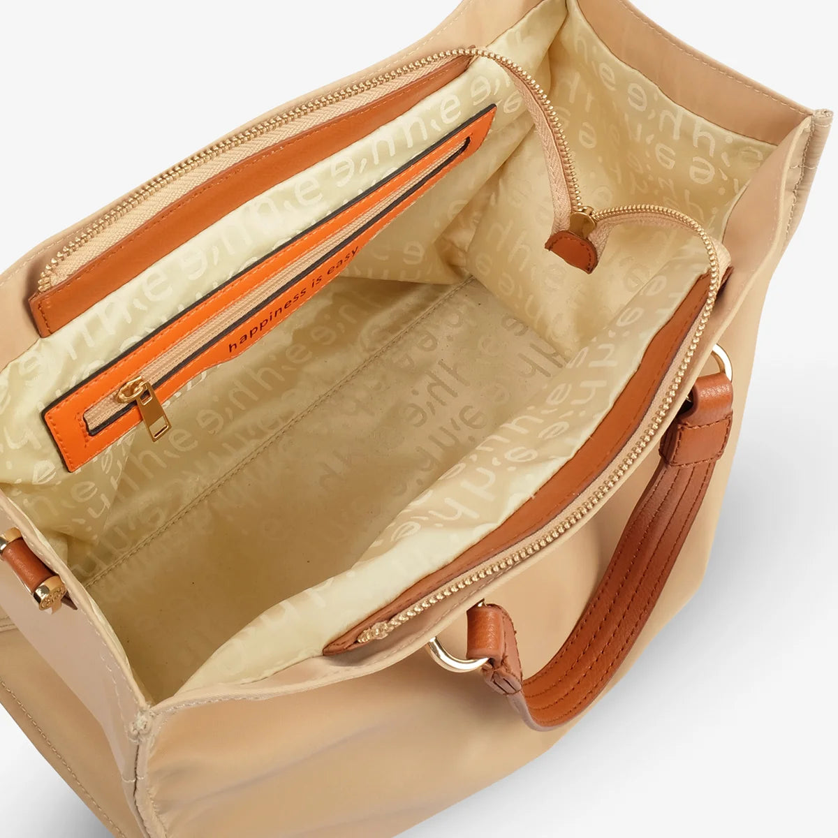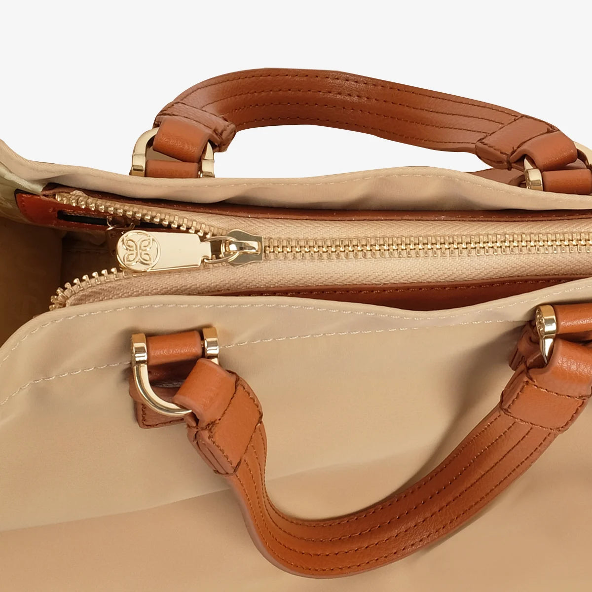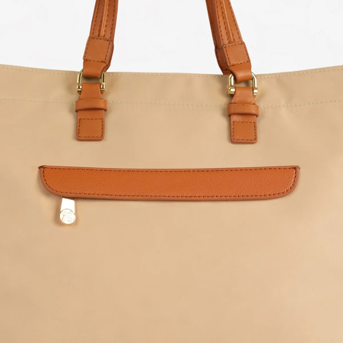 The Reya Tote is a medium-sized tote designed for travel and vacations, offering both style and convenience. Crafted from soft polyester fabric with elegant vegan leather trims, it is lightweight, practical, and easy to carry throughout the day. It also includes a crossbody handle for added versatility, making it a handy choice for keeping your essentials close while on the go. Finished with a metal zip closure and metal logo, the Reya Tote combines functionality with a polished look.