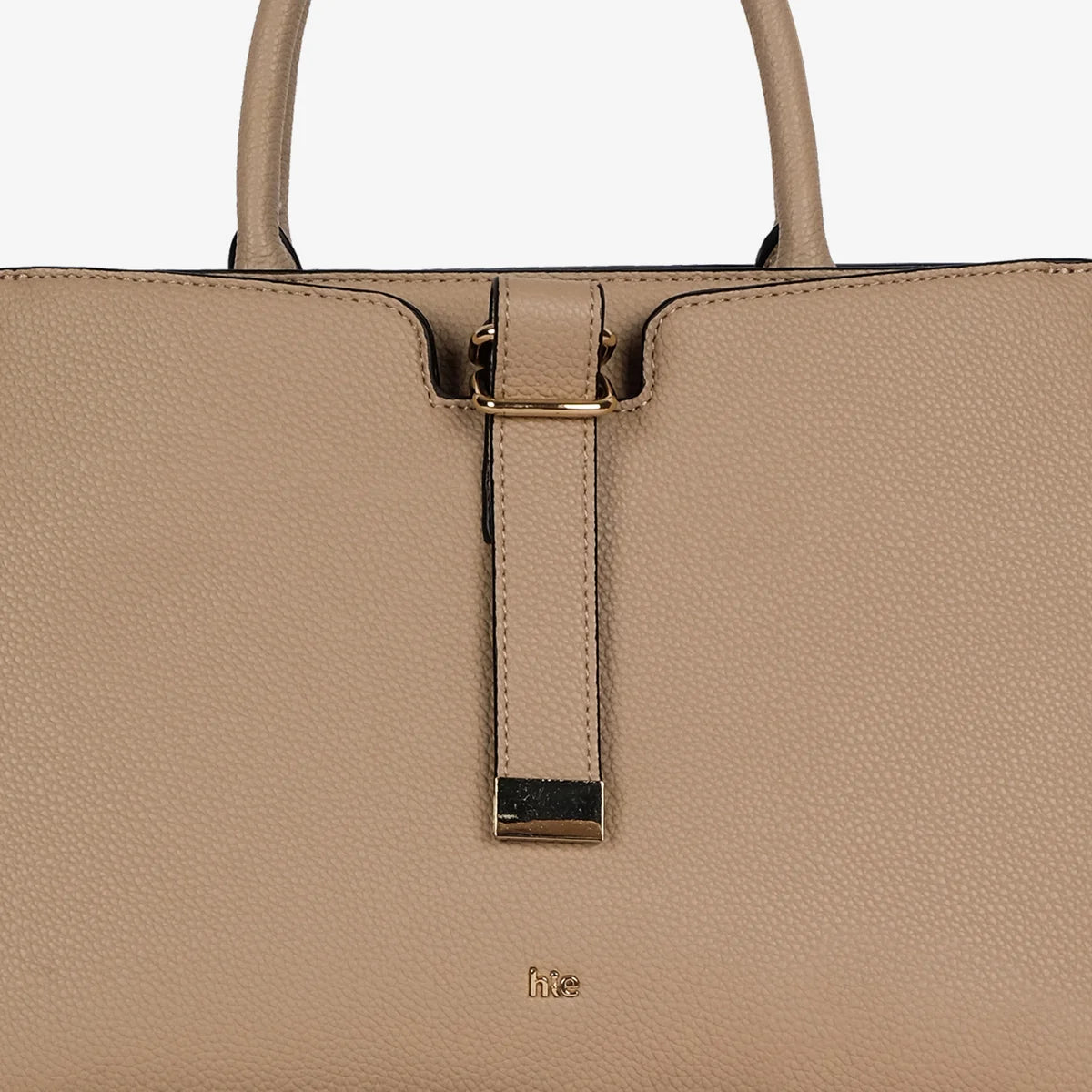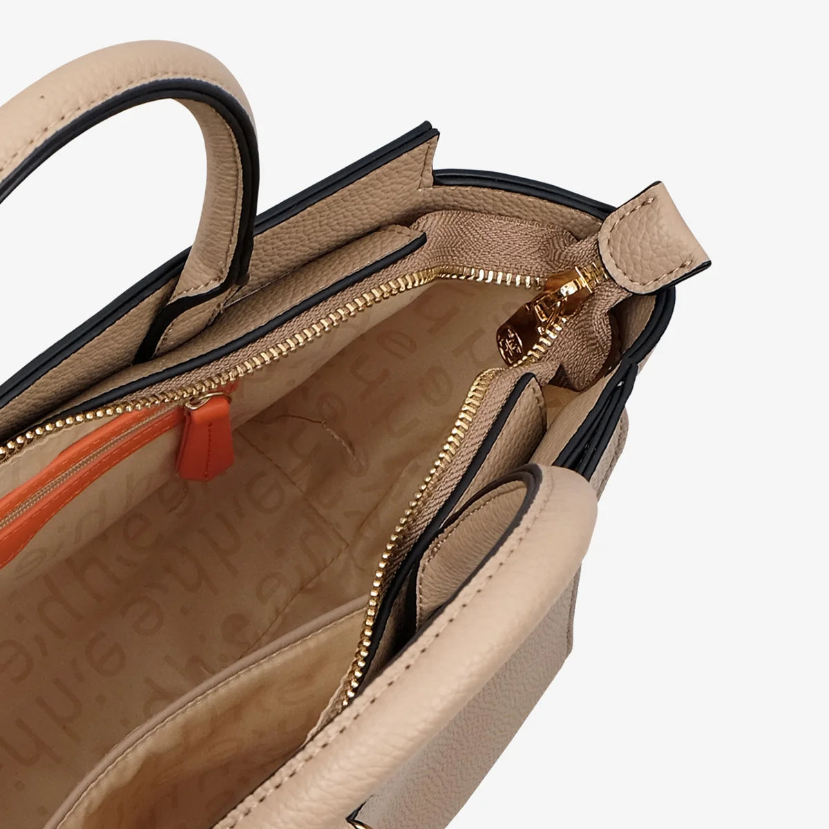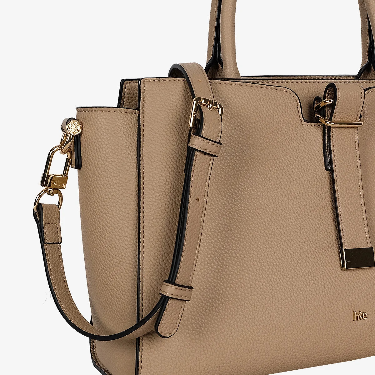 The Verona Satchel in Pebble Stone blends elegance and utility with its textured finish and structured silhouette. Gold-tone hardware and a stylish front clip enhance its luxurious feel. Carry it as a handbag or wear as a crossbody for added versatility. With secure Metal zip closure, branded lining, and spacious design, it’s perfect for daily sophistication.